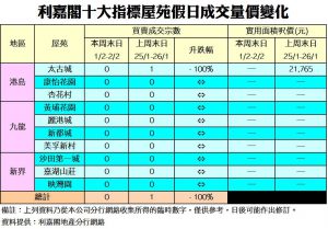 利嘉閣地產總裁廖偉強表示,本港樓市受到武漢肺炎疫情影響,現時買賣雙方均暫停睇樓活動,處於觀望階段,導致過去周末兩日本港十大屋苑二手市場錄得零宗成交是「不足為奇」,加上現時仍處於農曆新春佳節,為傳統的樓市交投淡季,所以二手市場成交急劇減少,陷入牛皮拉鋸局面。綜合利嘉閣地產分行網絡數據,在過去的周末日(2月1至2月2日)十大指標屋苑錄得零宗二手買賣個案,較對上周末(1月25至1月26日)的1宗減少1宗或再挫100%。