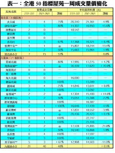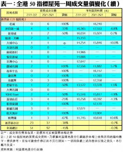 至於,新界區21個指標屋苑上周共錄23宗交投,按周減少38%,其中映灣園只有1宗買賣,按周大減67%;新港城、碧堤半島及YOHO Town分別錄得1宗、1宗及2宗成交,各自按周減少50%;熱門上車屋苑沙田第一城及嘉湖山莊,分別錄得4宗及3宗交投,較前周各自減少33%及25%。此外,在全港50個指標屋苑當中,上周共有19個屋苑錄得「零成交」,較前周的13個增加約46%,當中九龍區及新界區各佔9個及8個,港島區則佔2個(詳見表一)。