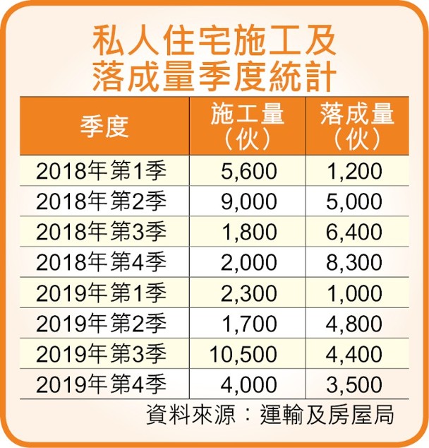 去年第四季的落成量為3,500伙,按季少900伙或20.4%,按年少4,800伙或57.83%;施工量為4,000伙,按季大減6,500伙或61.9%,按年多2,000伙或1倍。