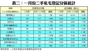 按全港三區作分析,一月份港九新界三區登記量全線下跌。當中,以港島區跌幅最大,月內共錄416宗登記,按月減少20%。九龍區亦有17%的跌幅,共錄得518宗登記;至於宗數最多的新界區則錄得1,027宗登記,按月少11%。另外,十大最活躍成交分區登記量亦跌多升少,當中以長沙灣/深水埗區的跌幅最大,月內僅錄65宗登記,按月急挫27%。至於買賣登記量最活躍的將軍澳區月內共錄114宗登記,惟按月也跌7%。