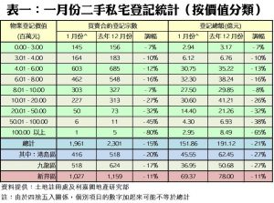 今年一月份,按二手私宅價值分類,9個價格組別的買賣登記量全線下跌,當中1億元以上的超級豪宅登記量跌幅最大,由十二月的5宗大減80%,至一月份只有1宗;其次,5,001萬至1億元的組別亦跌45%,錄得6宗。至於登記量佔比最多的401萬至600萬元組別則錄得603宗,按月亦跌12%。