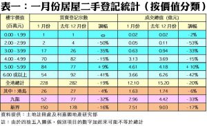 按樓價作分析(見表一),6個價格分類交投量共有4個向下,跌幅介乎15%至50%不等,其中價值600萬元或以上的「貴價」組別,成交宗數按月減少41%至54宗。如以地區劃分,新界區期內錄得150宗二手居屋登記,按月減少16%;而九龍及港島區各錄得52宗及26宗買賣,按月分別下跌32%及4%。