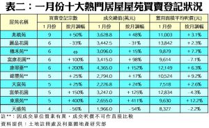 如按屋苑細分(見表二),屯門兆禧苑上月成交錄得9宗登記,較去年十二月份6宗成交按月增加50%,期內成交總值增加48%至約3,628.8萬元,成為上月最熱賣屋苑首位。