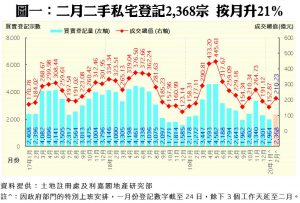利嘉閣地產研究部主管陳海潮表示,新型冠狀病毒肺炎導致土地註冊處於一月底暫停服務3天,而將原屬一月份的部分登記撥入二月,故二月登記量出現技術性上升。根據土地註冊處數據所得,2020年二月全港共錄2,368宗二手私宅買賣登記(數字主要反映一月中旬至二月上旬期間的市場實況),除較一月的1,964宗上升21%外,亦為近3個月最多。期內成交總值亦按月增38%,錄210.23億元;至於平均每宗登記涉資887.78萬元,按月升14%,且為7個月以來新高。