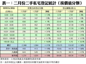 今年二月份,按二手私宅價值分類,9個價格組別的買賣登記量錄得8升1跌,當中1億元以上的超級豪宅登記量升幅最大,由一月的2宗大增1.5倍,至二月共有5宗;其次,5,001萬至1億元的組別亦升近1.2倍,錄得13宗。至於登記量佔比最多的401萬至600萬元組別則錄得650宗,按月亦升7%。