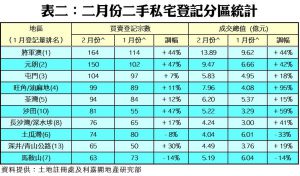 按全港三區作分析,二月份港九新界三區登記量全線上升。當中,以九龍區升幅最大,月內共錄644宗登記,按月上升24%。新界區則有19%的升幅,共錄得1,231宗登記;至於宗數最少的港島區也錄得493宗登記,按月亦升19%。另外,十大最活躍成交分區登記量亦升多跌少,當中以沙田區及元朗區的升幅最大,月內各錄81宗及150宗登記,按月同告升47%。至於買賣登記量最活躍的將軍澳區月內共錄164宗登記,按月也升44%。
