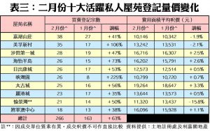 此外,上月十大活躍二手私人屋苑登記量錄得全線上升,當中升幅最大者為映灣園,月內有26宗登記,較一月份的8宗急跌升2.25倍;其次美孚新村亦升1.06倍,錄35宗登記。至於嘉湖山莊則以38宗之數,跑贏其他屋苑持續佔據上月最熱賣屋苑冠軍寶座,且按月亦升41%。