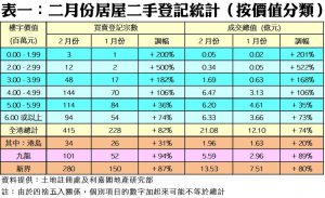 按樓價作分析(見表一),6個價格分類交投量全線向上,升幅介乎36%至5倍不等,其中價值600萬元或以上的「貴價」組別,成交宗數按月大增74%至94宗。如以地區劃分,新界區期內錄得280宗二手居屋登記,按月增加87%;而九龍及港島區各錄得101宗及34宗買賣,按月分別上升94%及31%。
