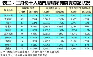 如按屋苑細分(見表二),將軍澳富康花園及天水圍天頌苑上月同樣錄得16宗登記,較一月份的6宗及2宗成交按月分別升1.67倍及7倍,期內成交總值分增加1.36倍及7.37倍至約8,072.8萬及6,644.8萬元,雙雙成為上月最熱賣屋苑首位。