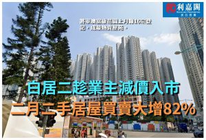 利嘉閣地產研究部主管陳海潮表示,儘管新型冠狀病毒疫情持續困擾,但由於不少業主願意減價,刺激剛獲發購買證的白居二買家積極入市,帶動上月居屋買賣登記急增。根據土地註冊處最新數據顯示,二月份全港錄得415宗居屋二手買賣登記(包括第二市場及自由市場),較一月份228宗按月大增82%,創9個月新高;而期內成交總值共錄約21.08億元,較一月份的12.10億元,按月增加74%,創近9個月新高。