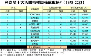 利嘉閣地產董事陳大偉表示,多國央行「放水」救經濟,市場氣氛向好,惟二手平盤匱乏,屋苑交投窄幅橫行整固。綜合利嘉閣地產分行數據所得,全港十大活躍指標屋苑在上周(16/3–22/3)錄64宗買賣個案,較前周(9/3–15/3)的60宗按周上升7%,買賣氣氛保持不俗。