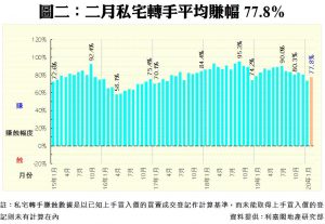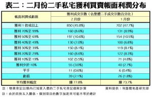 數據顯示,今年二月份每宗私宅轉手個案平均賺幅為77.8%,連跌2個月後略見回升,但仍少於80%及為14個月以來的第二低水平(見圖二)。二月份,帳面獲利1倍或以上的轉手個案佔整體二手私宅買賣比例略見回軟,達45.8%,按月跌1.9個百分點,共錄得850宗;至於帳面錄得虧損者有39宗,佔比按月增至2.1%,而平手的個案有11宗,比例亦按月增加至0.6%。