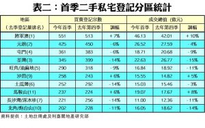 按地區分析,從買賣交投量最活躍的十個地區觀察,錄得七跌三升,當中以土瓜灣、長沙灣/深水埗及荃灣三區的二手私宅登記量跌勢最顯著,同跌14%,季內分別錄得252宗、221宗及345宗登記;而將軍澳區登記量則錄得7%的升幅,共有551宗,並成為登記量最活躍的地區。