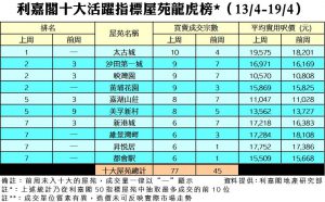 利嘉閣地產董事陳大偉表示,本地新冠肺炎疫情有所緩和,壓抑的購買力陸續釋放,帶動二手屋苑成交進一步轉活。綜合利嘉閣地產分行數據所得,全港十大活躍指標屋苑在上周(13/4–19/4)錄77宗買賣個案,較前周(6/4–12/4)的45宗按周大升71%,平均每個屋苑買賣逼近8宗,整體買賣氣氛持續向好。