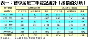 以樓價分類作分析,登記量較多的價值400萬至499萬元組別,買賣登記量按季逆市上升14%至331宗,期內成交總值為14.84億元,按季同樣增加14%。至於,600萬元或以上的「貴價」組別,首季錄得232宗買賣登記,總值15.67億元,量值按季同樣減少15% (詳見表一)。