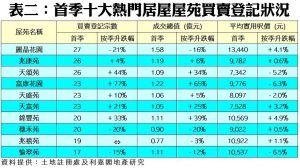 在今年首季十大活躍成交的居屋屋苑當中(詳見表二),錄得買賣宗數跌幅的屋苑只有3個,其中九龍灣麗晶花園的登記量跌幅最大,按季減少21%至27宗成交,期內成交總值1.58億元,按季下跌16%,但仍然為上季成交最活躍的居屋屋苑。