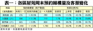 新界區方面,21個指標屋苑本周末暫有665組客戶預約睇樓,按周上升9.9%,而4天假期則暫錄800組。利嘉閣地產葵青-青衣灝景灣一行首席聯席市務董事彭錦添表示,市場氣氛轉趨熾熱,連帶區內二線屋苑交投亦見彈升,例如今個月藍澄灣錄得約10宗買賣,較上月急增一倍。彭錦添指出,由於一手市場平靜,購買力加快流入二手市場「執平貨」,部分買家積極睇樓還價,預期下月當新盤陸續登場,料整體買賣氣氛會更為高漲,而今個五一長假期區內屋苑預約參觀客量活躍。