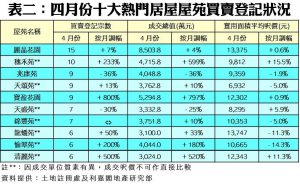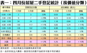 如按屋苑細分(見表二),將軍澳寶盈花園四月錄得9宗買賣,按月急增8倍,升幅最為顯著;至於,九龍灣麗晶花園上月錄得15宗登記,較三月份的14宗按月增加7%,期內成交總值亦增加4%至8,503.8萬元,成為上月最熱賣屋苑首位。