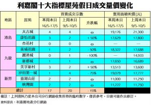 《利嘉閣十大指標屋苑假日二手實況》 二手盤源消化 新盤再次群起 十大屋苑周末錄17宗成交 按周跌15%