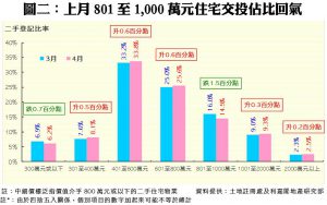 陳海潮指出,本地疫情並無大爆發,加上全新盤尚未推出,導致四月份買賣登記流入二手市場為主,在7個銀碼組別中,錄得5升2跌。當中以銀碼介乎601萬至800萬元的升幅最顯著,佔比由25.0%增加0.6個百分點,至25.6%。至於銀碼介乎401萬至600萬元者則仍是最主流的登記類別,月內錄得佔比33.8%,亦按月升0.6個百分點。不過,銀碼介乎801萬至1,000萬元者,經前月大錄16%佔比後,上月按月回落1.5個百分點,反映相關銀碼購買力略作回氣(詳見圖二)。