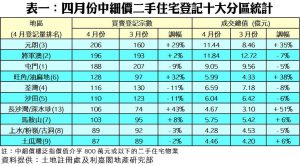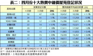 以屋苑層面分析,在疫情轉趨緩和下,之前壓抑的購買力陸續入市,刺激四月絕大部分活躍中細價屋苑買賣登記量均錄得不俗的升幅(詳見表二);當中升幅最顯著者為YOHO TOWN,交投量按月大增1.3倍,由三月只有12宗升至上月共28宗;而金獅花園及大興花園亦分別錄得57%及45%的升幅。至於成交最旺、仍然佔據榜首的是嘉湖山莊,按月亦微升6%,全月共錄得50宗登記。