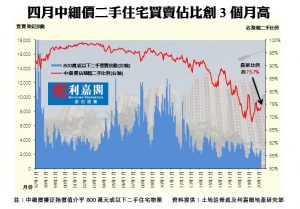 利嘉閣地產研究部主管陳海潮表示,隨著疫情高峰過後略為好轉,剛性住屋需求加快入市中細價物業。綜合土地註冊處最新資料,2020年四月份全港共錄2,654宗價值800萬元或以下的二手住宅買賣登記,佔同期整體二手住宅買賣登記(3,599宗)比例約73.7%,較三月份約72.7%上升1個百分點,連升兩月且升幅加大。疫情稍見緩和,料初期購買力也較集中在中細價物業,預期五月份仍以800萬元或以下的中小型住宅交投作主導。