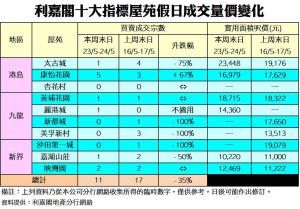於剛過去的周末十大指標屋苑買賣當中,按地區劃分,表現最佳為香港區,共錄得6宗成交,但仍較上周減少1宗;新界區共有3宗成交,按周減少2宗;九龍區則錄得2宗成交,按周減3宗。若以屋苑劃分,康怡花園表現最佳,錄得5宗成交;其次是映灣園的2宗成交;太古城、黃埔花園、麗港城及嘉湖山莊分別錄得1宗;其餘杏花村、新都城、美孚新村及沙田第一城等四個屋苑本周末同樣錄得零成交。