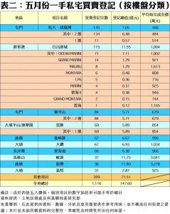 按樓盤分類,恆大‧珺瓏灣2期上月錄134宗登記,成為五月份登記量最多的一手私宅項目,登記總值達6.48億元,平均每宗登記約484萬元;次名為御半山2期的84宗登記,第三是將軍澳OCEAN MARINI的71宗。至於登記排行榜內上月平均每宗買賣成交價最高者為龍譽的3,278萬元,而較低平均價者是恆大‧珺瓏灣2期的484萬元。