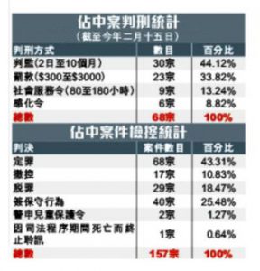 以兩年多前的佔領行動為例,期間多次出現暴力衝突,到昨日為止,法庭已經宣判的祇有157宗案件,當中僅68宗定罪,有30宗判監兩天至十個月不等,其餘分別判處社會服務令、感化令,或罰款300至3,000元不等。