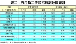 此外,上月十大活躍二手私人屋苑登記量全錄升幅,並以太古城1.4倍的升幅最大,月內有36宗登記,較四月的15宗大增;其次淘大花園亦升1.13倍,錄32宗登記。至於沙田第一城則取代嘉湖山莊成為上月最熱賣屋苑,前者增66%至58宗,後者增6%至53宗。