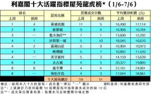 利嘉閣地產董事陳大偉表示,新盤市場熱鬧,吸納不少購買力,部分向隅資金回流二手市場,惟二手屋苑平盤選擇不多。綜合利嘉閣地產分行數據所得,全港十大活躍指標屋苑在上周(1/6–7/6)錄59宗買賣個案,較前周(25/5–31/5)的51宗按周增加16%,平均每個屋苑買賣約6宗,市況表現平穩。