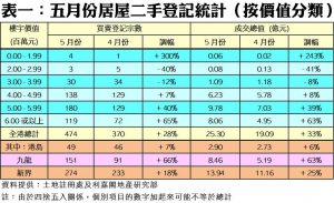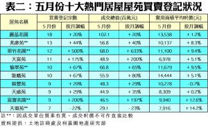 如按屋苑細分(見表二),黃大仙翠竹花園五月錄得12宗買賣,按月急增5倍,升幅最為顯著;至於,九龍灣麗晶花園上月錄得18宗登記,較四月份的15宗按月增加20%,期內成交總值同樣增加20%至1.02億元,成為上月最熱賣屋苑首位。