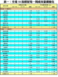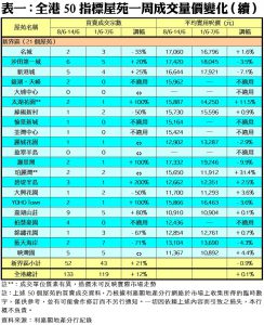 至於,港島區8個指標屋苑上周共錄18宗成交,按周減少2宗或10%,其中鯉景灣及海怡半島分別錄得1宗及2宗交投,按周各自減少50%;康怡花園及杏花村各錄2宗買賣,按周減幅分別有33%;藍籌屋苑太古城則錄得6宗買賣,較前周的4宗增加50%。此外,在全港50個指標屋苑當中,上周共有5個屋苑錄得「零成交」,較前周的11個減少55%,當中港島區佔1個,九龍區及新界區則各佔2個(詳見表一)。