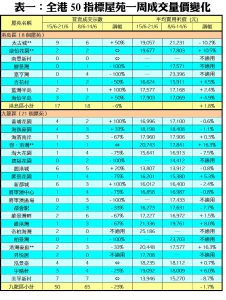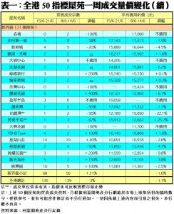 至於,新界區21個指標屋苑上周累錄68宗交投,較前周的56宗增加21%,其中麗城花園連錄5宗成交,按周增幅達4倍;綠楊新村及錦繡花園各錄3宗買賣,分別按周增加2倍;藍天海岸期內錄得5宗買賣,較前周的2宗增加1.5倍;YOHO Town及映灣園則各有4宗及10宗成交,按周增加分別達1倍。此外,在全港50個指標屋苑當中,上周共有9個屋苑錄得「零成交」,較前周的5個增加80%,當中港島區、九龍區及新界區各佔3個(詳見表一)。