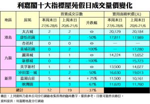 《利嘉閣十大指標屋苑假日二手實況》 新盤熱賣成焦點 二手成交被拖低 十大屋苑周末錄12宗買賣 按周跌37%
