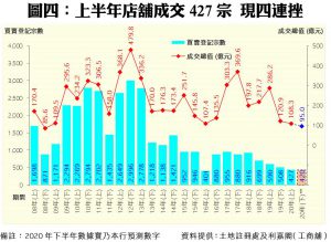 利嘉閣(工商舖)地產-商舖、商業及投資部高級營業董事鄭得明表示,承接去年下半年的社會運動,店舖市埸一波未平一波又起,今年初遇上新冠病毒疫情,在旅客及本地零售消費和外出餐飲意欲急降下,拖垮店舖市道。下半年疫情仍然反覆,料登記量仍橫行偏軟。截至6月30日止的上半年,店舖物業買賣合共錄得427宗,較去年下半年的508宗減少16%,連續四個半年度出現下跌,並創自2016年上半年以後的八個半年度新低,以半年度計亦是有紀錄以來的次低;至於成交金額方面,今年上半年店舖登記金額錄108.35億元,較去年下半年的120.89億元減少10%,同創八個半年度新低。