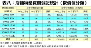 按物業價格分析,在7個價格組別的店舖物業交投量當中,有6個均出現下調,只有介乎2,000萬至5,000萬元以內組別的登記量逆市向上,上半年共錄得92宗,按半年增加28%。至於,減幅最大的組別為1億元或以上的大額店舖買賣,上半年登記量僅錄11宗,按半年大減58%;而其他銀碼組別的按半年減幅則由10%至37%不等(見附錄表八),反映過去半年各類型價格店舖買賣幾近全面陷於低迷。