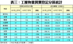 按地區劃分,在10個觀察區之中,有8個地區買賣登記量錄得跌幅,當中三大傳統工廈「重鎮」葵涌、荃灣及觀塘均見跌幅,並以觀塘跌39%最多,半年僅錄95宗登記,而葵涌期內錄得152宗買賣,成為最旺的觀察區,惟按半年亦挫29%,至於荃灣也跌10%至只有129宗買賣。另外,柴灣及屯門區則逆市造好,上半年買賣登記量分別有26宗及56宗,按半年各增18%及8%。