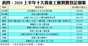 從個別成交個案分析,上半年十大貴重工廈買賣登記的金額介乎5,240萬元至最高的7.90億元;當中,排榜首者為長沙灣道924及926號全幢登記,涉資7.90億元;其次為同區的永昌工廠大廈全幢,涉資約3.95億元。在十大貴重成交當中,全幢工廈成交只佔了2席,均位於長沙灣區,反映疫情之下,全幢的大手交投偏向淡靜。