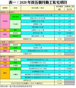 連同上述項目,2020年首五個月全港共有18個私宅項目動工,涉及單位總數5,184伙。當中以新界區的施工伙數最多,涉及7個項目合共2,774伙,單位佔整體比例約53.5%;港島區則有8個私宅項目動工,單位數量1,279伙,佔整體比率約24.7%;九龍區共有3個項目、合共1,131個單位動工,佔整體比例約21.8%。