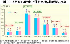 陳海潮指出,近月二手住宅交投連月回升,市場氣氛轉旺,釋出不少換樓及中高價住宅買家利用放寬按保樓價上限的購買力出籠,帶動六月800萬元以上物業交投佔比連番走高。在7個銀碼組別中,錄得4升3跌,當中以銀碼2,000萬元以上物業的升幅最顯著,佔比由2.6%增加1.2個百分點,至3.8%。至於銀碼介乎1,001萬至2,000萬元者亦升0.7個百分點至11.4%,反映中高價物業交投轉旺。至於銀碼介乎401萬至600萬元的主流登記類別,則錄得最大跌幅,月內佔比31.0%,按月挫2.3個百分點。