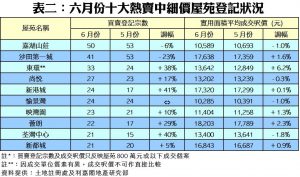 以屋苑層面分析,上月十大熱賣中細價屋苑登記量表現不一,當中登記量最多、最受市場歡迎的兩大上車屋苑嘉湖山莊及沙田第一城交投量雙雙回軟,其中前者整月錄得50宗登記,按月跌6%,而沙田第一城更急跌23%,由五月的53宗跌至六月只有41宗(詳見表二)。至於月內買賣登記量升幅較大的屋苑則為新港城及荃灣中心,分別錄得24宗及21宗交投,各自按月升41%及40%。