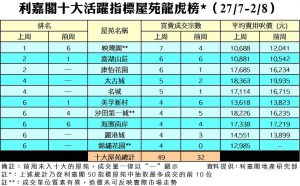 利嘉閣地產董事陳大偉表示,受本地疫情持續惡化及限聚令收緊影響,二手市場交投活動減慢。綜合利嘉閣地產分行數據所得,全港十大活躍指標屋苑在上周(27/7–2/8)錄49宗買賣個案,雖較前周(20/7–26/7)的32宗按周增加53%,但平均每個屋苑買賣僅約5宗,表現只屬平平。