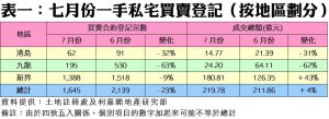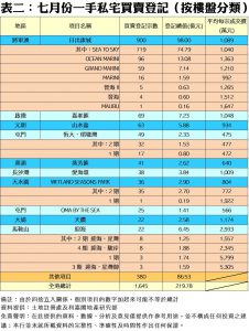 至於新界區方面,受惠之前大型新盤開售,並於月內錄得多宗登記,帶動區內七月份的一手私宅登記勁錄1,388宗,惟較六月份仍跌9%,但屬表現最理想的一區,而涉及買賣登記金額更逆市大漲43%,由六月份的126.35億元增至上月的180.81億元。當中買賣登記量主要由將軍澳單一新盤撐起,已佔整區近半登記。