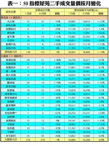 列入觀察名單的50個指標屋苑當中,上月樓價報跌的屋苑有27個,佔整體比率54%,報升者則有23個。當中,上月樓價錄得實質跌幅較顯著的屋苑包括九龍灣德福花園、新蒲崗譽‧港灣、將軍澳新都城及馬鞍山銀湖‧天峰,分別錄7.9%、4.8%、4.1%及4.0%的實質跌幅。至於錄得樓價升幅較顯著的指標屋苑包括小西灣藍灣半島、奧運站維港灣、西灣河鯉景灣及嘉亨灣,實質按月升幅分別為7.2%、6.6%、6.6%及4.0%。