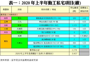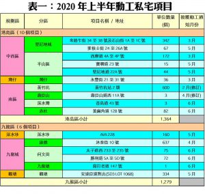連同上述項目,2020年上半年全港共有25個私宅項目動工,涉及單位總數5,422伙。當中以新界區的施工伙數最多,涉及9個項目合共2,779伙,單位佔整體比例約51.2%;港島區則有10個私宅項目動工,單位數量1,364伙,佔整體比率約25.2%;九龍區共有6個項目、合共1,279個單位動工,佔整體比例約23.6%。