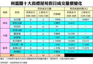 《利嘉閣十大指標屋苑假日二手實況》 交投穩中向好 連續四個周末錄雙位數 十大屋苑周末18宗買賣 按周增2宗