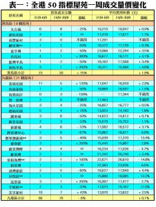 至於,港島區8個指標屋苑上周累錄23宗成交,按周增加3宗或15%,其中杏花村交投量由前周的1宗,大增3倍至上周的4宗;海怡半島期內錄得3宗成交,按周增幅亦達2倍;藍籌屋苑太古城錄得6宗買賣,較前周的8宗減少25%。此外,在全港50個指標屋苑當中,上周共有7個屋苑錄得「零成交」,較前周的6個增加17%,當中九龍區及新界區各佔1個及6個,港島區則全部指數屋苑均錄得成交(詳見表一)。