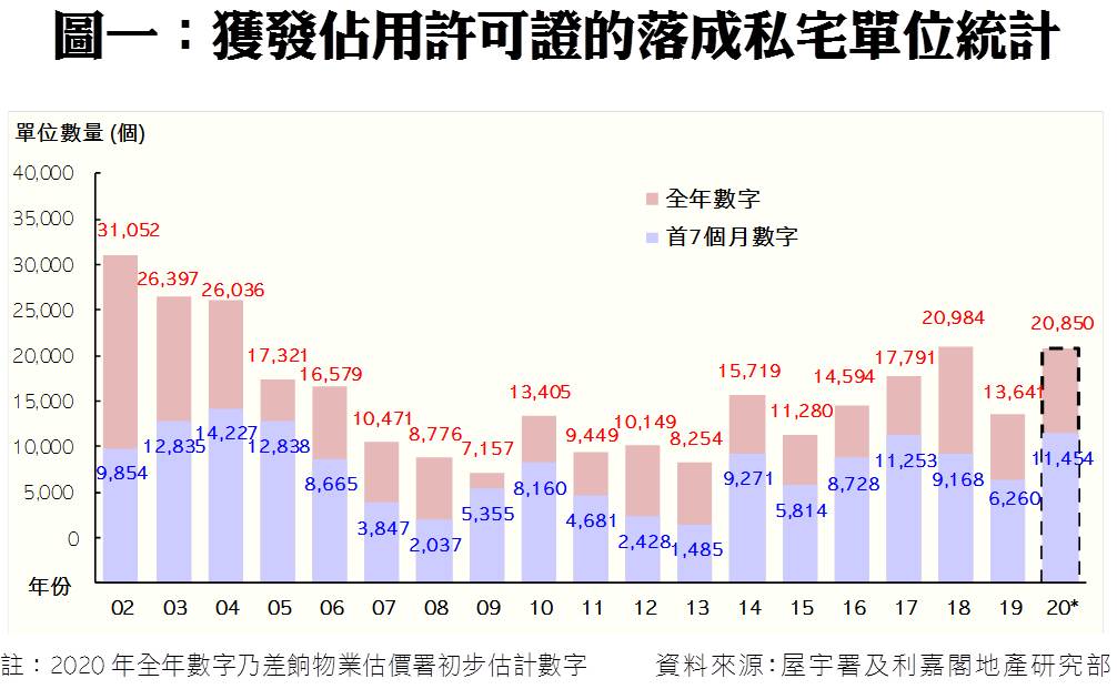 陳海潮指出,今年首7個月落成量佔差估署2020年全年預測的20,850伙約55%,進度表現仍符合預期,估計今年餘下月份將有數個大型項目可望趕及竣工,當中包括大埔「天鑽」(1,620伙)、將軍澳日出康城5期MALIBU(1,600伙)、觀塘「凱匯」(1期)(1,025伙)、天水圍「Wetland Seasons Park」(1期)(710伙)、白石角「雲匯」(2期)(640伙)等,再加上其他中小型發展項目,初步估計2020年全年落成量可接近1.9萬至2萬伙水平。