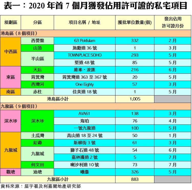 利嘉閣地產研究部主管陳海潮表示,受疫情爆發第三波影響,部分項目入伙審批進度受阻。根據屋宇署今天最新發表的資料月報顯示,2020年七月份全港只有3個項目,僅83個私人住宅單位落成(以屋宇署發出佔用許可證的樓宇數量為準),較六月份的1,365伙急挫94%,創近三年半單月最少。不過,今年落成數字仍然頗高,首7個月共有11,454伙私宅落成,較去年同期的6,260伙按年大增約83%,為自2005年後15年同期最多。
